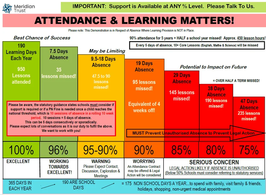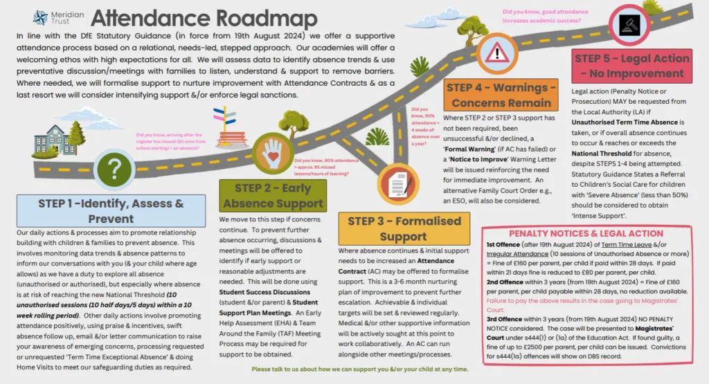 This academy, and all other Meridian academies, continue to support Local Authorities (LA) with improving attendance by using sanctions for absences which fall into the above criteria. This is under the powers of Section 23 of the Anti-Social Behaviour Act 2003 and are issued under The Education (Penalty Notices) (England) (Amendment) Regulations 2007 & amendments 2012, 2013 & 2024.