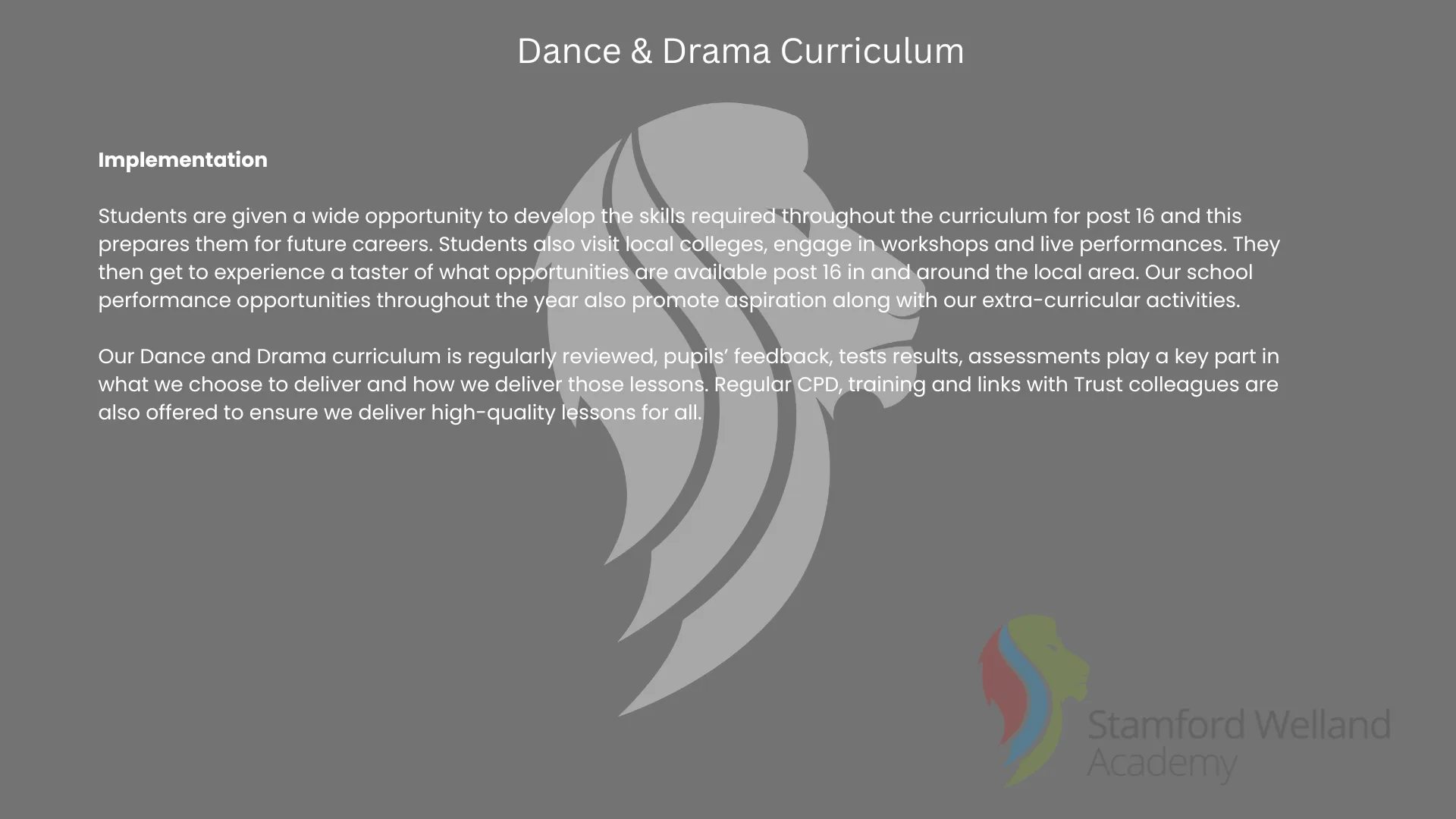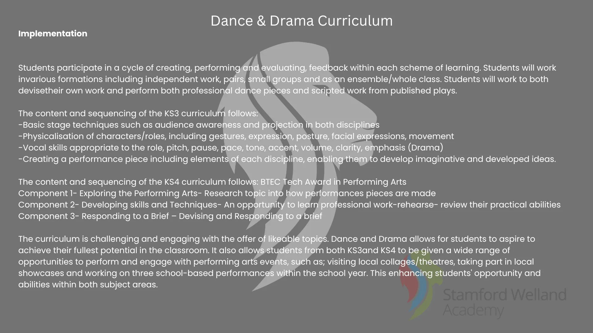 Within the curriculum topics covered in lessons also allows students from both KS3 and KS4 to be given a wide range of opportunities to perform and engage with performing arts events, such as; visiting local collages/theatres, taking part in local showcases and working on three school-based performances within the school year. This enhancing students' opportunity and abilities within both subject areas and giving them a taster of further education and careers options within Dance and Drama.