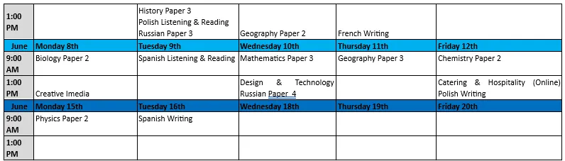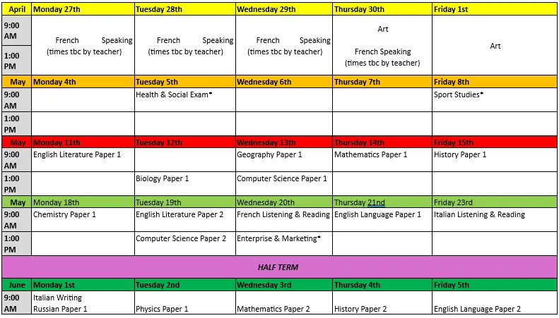 Summer GCSE Exam Timetable