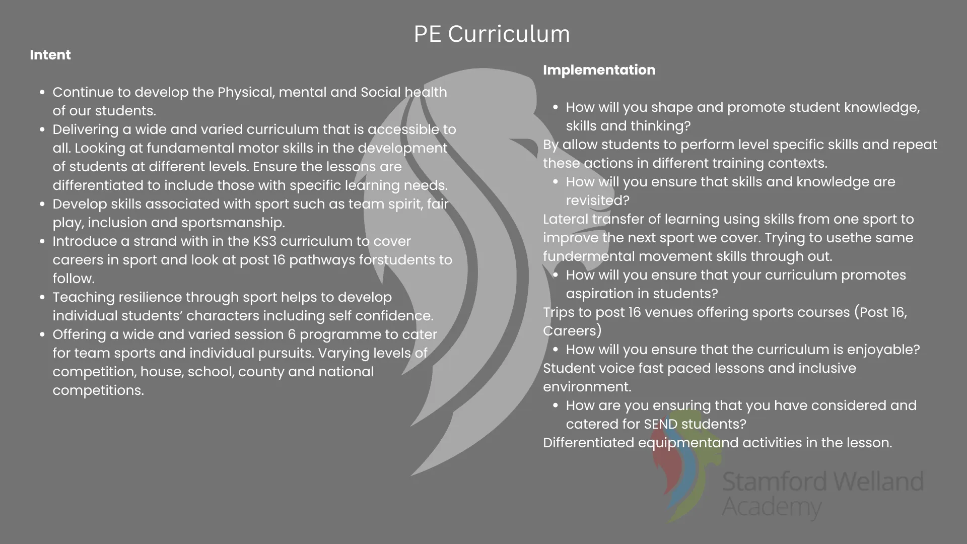 Physical Education at Stamford Welland Academy is all about inspiring students to lead active, healthy and confident lives. Our PE curriculum provides a broad range of sporting experiences designed to develop physical competence, teamwork, resilience and a lifelong enjoyment of physical activity.