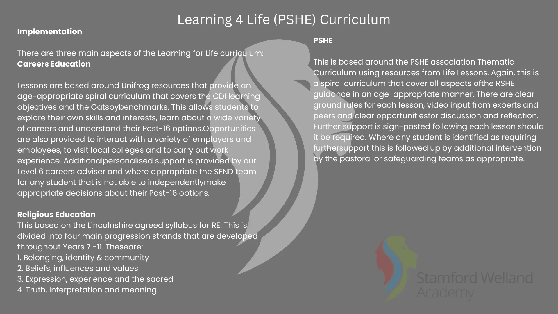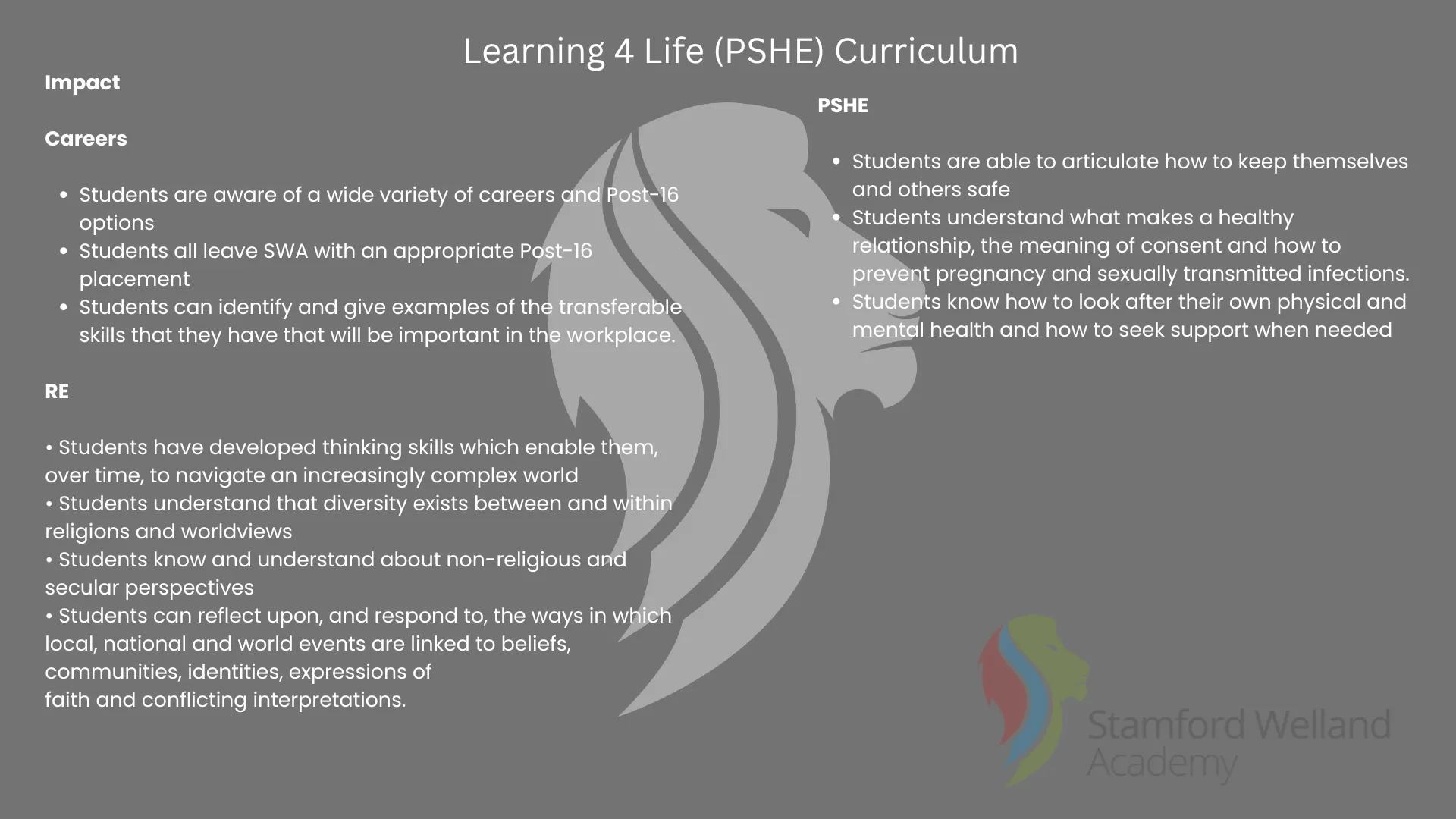 The intent of the Learning for Life (PSHE) curriculum is to ensure that all students have the skills and knowledge required to become well-rounded adults that are able to make an active contribution to society and are able to make well informed decisions about their health, their life choices and how to achieve their future goals.