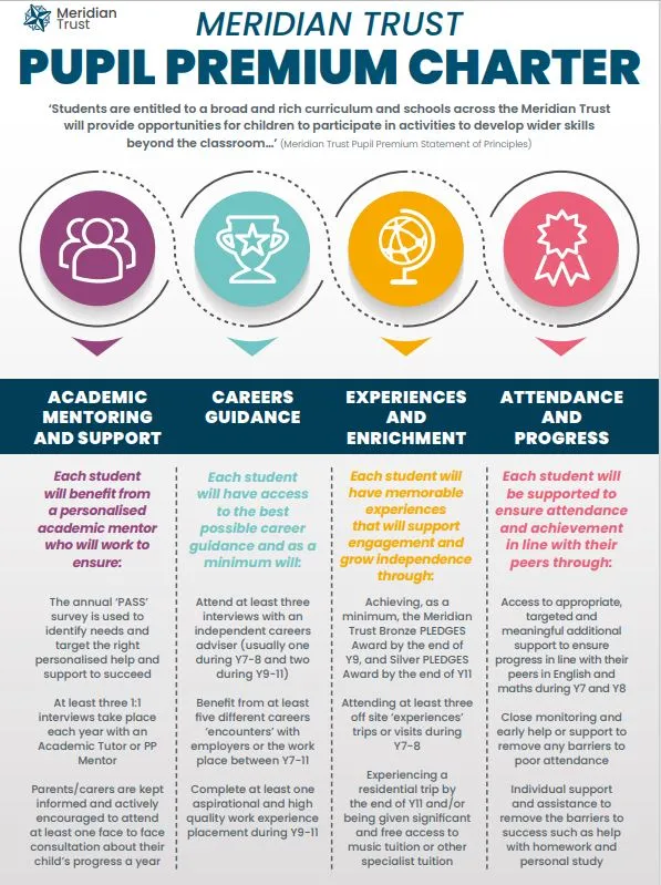 There are a number of activities outlined in ‘The Strategy Document’ which have been taken from the ‘Meridian Pupil Premium Charter’ . This Charter closely follows the principles outlined in the ‘Meridian Statement of Principals’ .